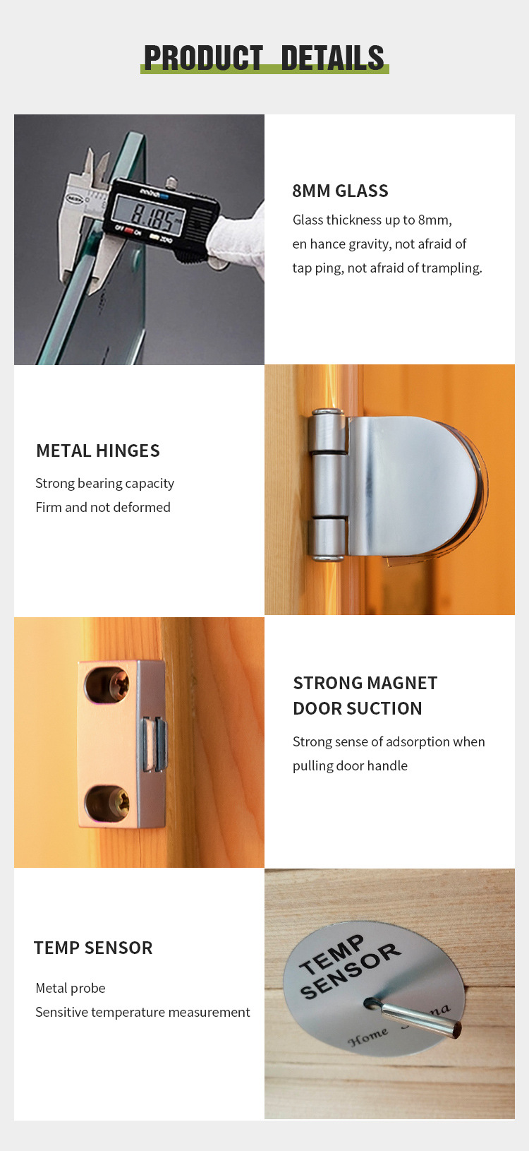 8MM Temperli Cam: 1-3 kişilik ahşap Infrared ve Buhar Sauna Odası ürün detaylarında görüldüğü gibi 8mm kalınlığında temperli cama sahiptir. Olağanüstü dayanıklılığa sahiptir ve yerçekimi direncini artırır. Vurma veya ayaklar altına alma konusunda endişelenmenize gerek yok; günlük kullanıma dayanacak şekilde üretilmiştir.
