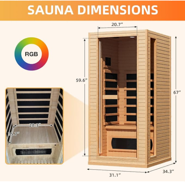 Kompakt gövdesi (genellikle yaklaşık 100 × 80 × 190cm ölçümlü) evler ve daireler gibi küçük alanlar için uygundur ve kullanımı kolaydır. Dahili olarak konforlu banklar ve nefes alabilen örgü tasarımı ile donatılmış, akıllı bir sıcaklık kontrol sistemi (30-65 ℃ ayarlanabilir sıcaklık aralığı) ile birleştiğinde, süre, güvenlik ve konforu dengeleyerek ihtiyaçlara (0-60 dakika) göre ayarlanabilir.