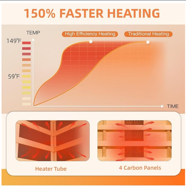 【Verimli ısıtma teknolojisi】 4 karbon paneli ve 1 karbon tüpü ile donatılmış 1 kişi kızılötesi sauna, 360 derecelik surround ısıtma sağlar ve eşit ısı dağılımını sağlar. Tipik olarak, sadece 10-15 dakika içinde ısınır ve sauna deneyiminizin gecikmeden tadını çıkarmanıza izin verir.
