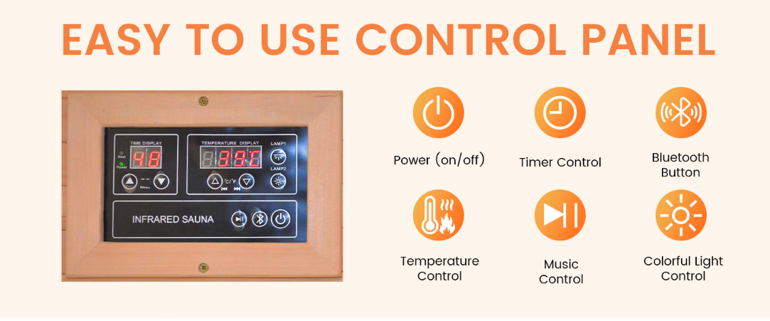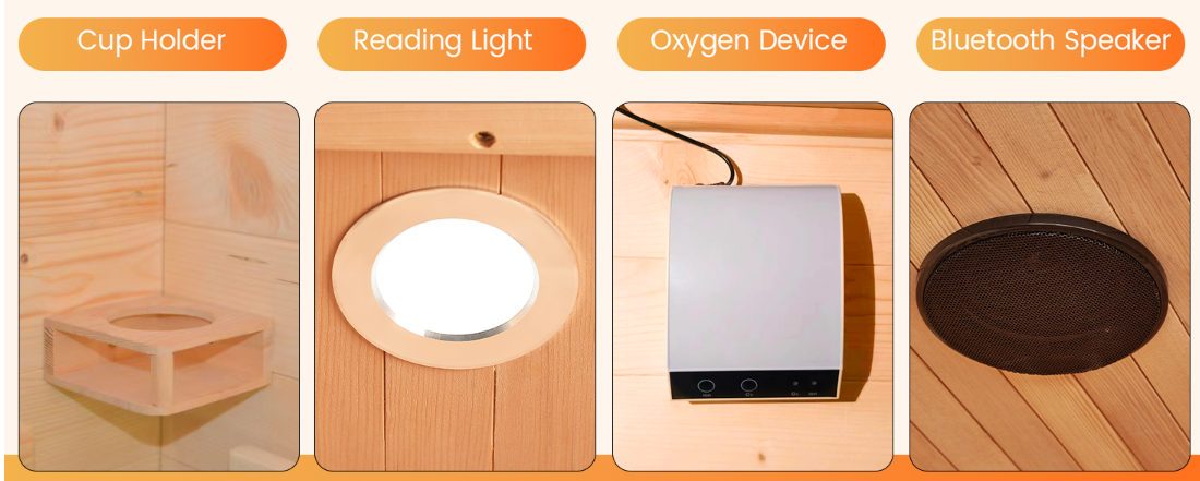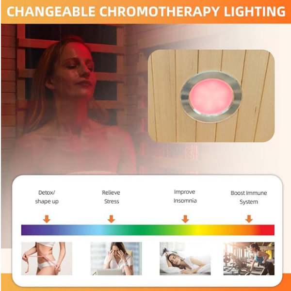 【Gelişmiş rahatlama】 Ev için kızılötesi saunalarımız, 7 renkli ışık tedavisi ile aydınlatılmış bir çatıya sahiptir ve genel deneyiminizi geliştirmek için sürükleyici bir atmosfer oluşturur. Bodrumunuza, banyonuza veya spor salonunuza kolayca kurulabilir ve Bluetooth bağlantısı ve oksijen çubuğuyla, rahatlatıcı bir sauna oturumunun tadını çıkarabilirsiniz.