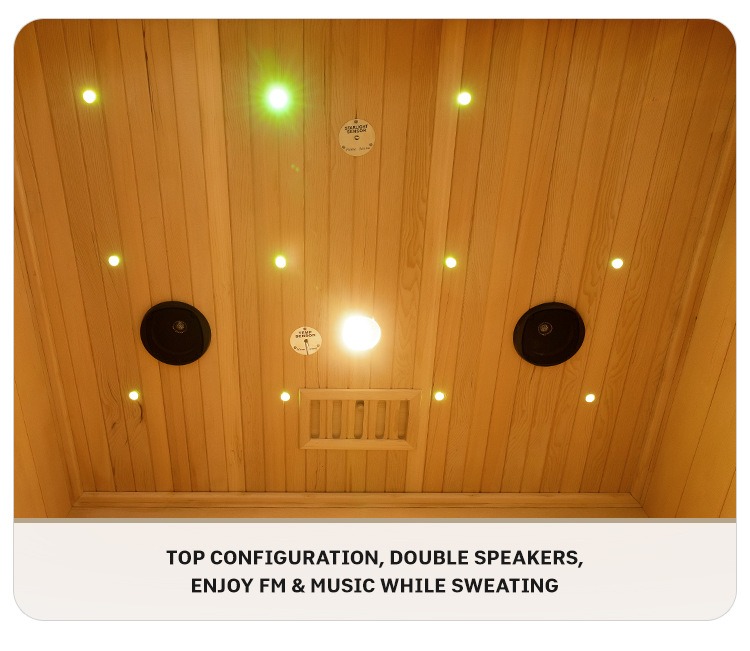 Üst kısımda FM radyoyu ve müzik çalmayı destekleyen çift hoparlörlü bir sistem yapılandırılmıştır. Terlerken en sevdiğiniz melodilerin veya radyo programlarının keyfini çıkarabilir, sürükleyici sauna deneyimini geliştirebilirsiniz.