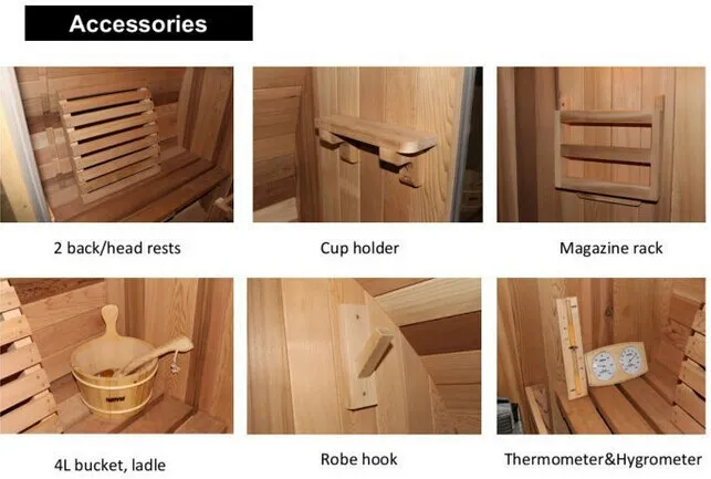 - Kullanışlı Aksesuarlar: Bardak tutucu, dergi rafı, yerleşik elbise askısı (kıyafetleri ve havluları rahat bir şekilde saklamak için, sauna seansları sırasında dağınıklığı ortadan kaldırmak için);